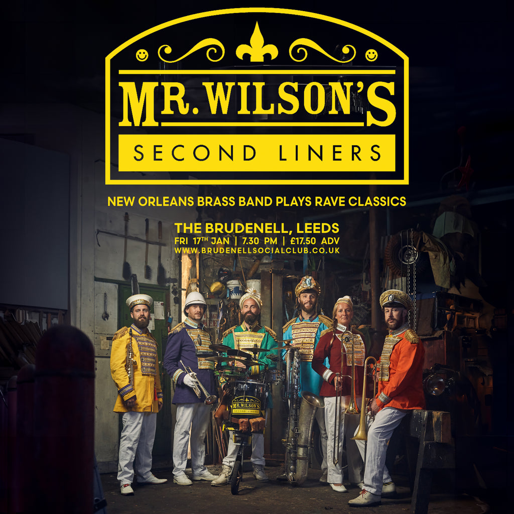 A rabble of mischievous northerners, Mr Wilson’s Second Liners form a traditional New Orleans Second Line. However, this is no sombre occasion: Mr Wilson’s expend their collective musical talent paying homage to the diehard days of the Hacienda, 90s club culture and its greatest hero, Mr Tony Wilson.